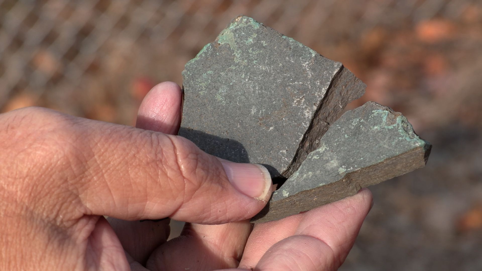 A sample of the Copperwood ore, dug up years ago during early exploration of the mine site. Still from video by Mark Doremus.