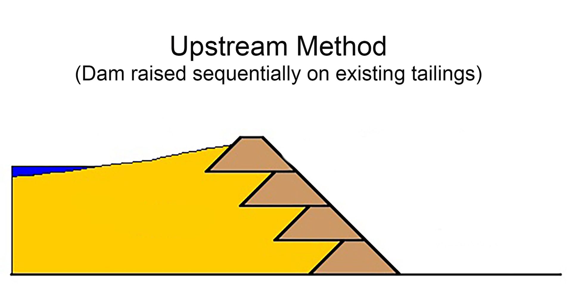 Most existing tailings dams, including the Samarco, Brumadinho and Mount Polley dams, were built with the lower-cost “upstream” method. The dam is raised in stages over time, with each new segment built on top of previously deposited tailings.