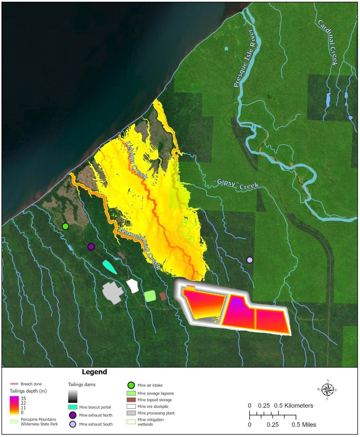 If the Copperwood dam failed catastrophically, “mine waste, up to 14 meters in depth” would surge down watercourses into Lake Superior, according to the Protect the Porkies website, citing a 2024 report from the Great Lakes Indian Fish and Wildlife Commission (GLiFWC).