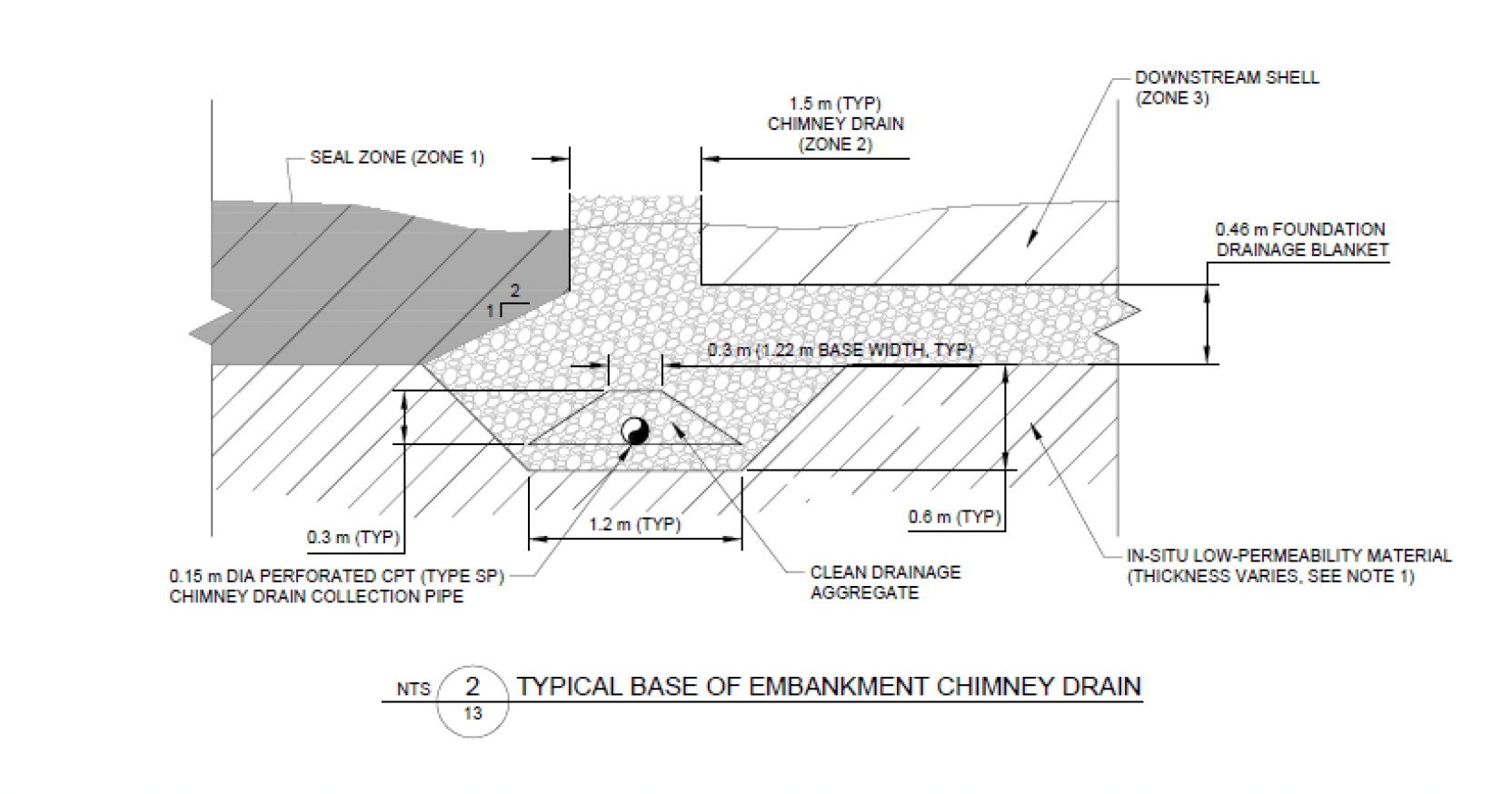 A “chimney” or “curtain” drain down the middle of the Copperwood dam would capture leakage and redirect it before it could potentially weaken the structure, according to Highland’s most recent planning document. Source: Highland Copper, 2023 Feasibility Study Update, Copperwood Project.